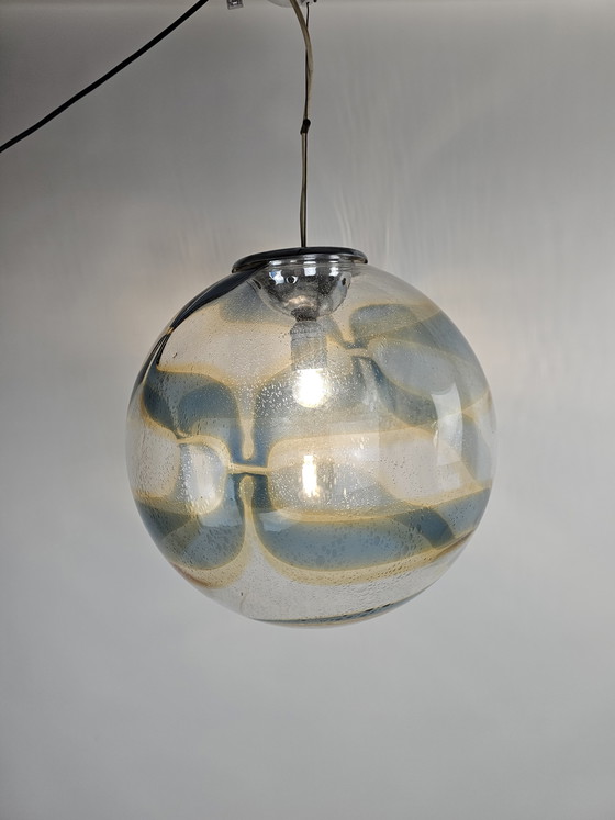 This beautiful 40 cm Italian globe pendant lamp is a sophisticated addition to any interior. With its elegant glass globe and subtle color palette of blue and cream, this lamp exudes a timeless charm that fits perfectly in both modern and classic settings.
