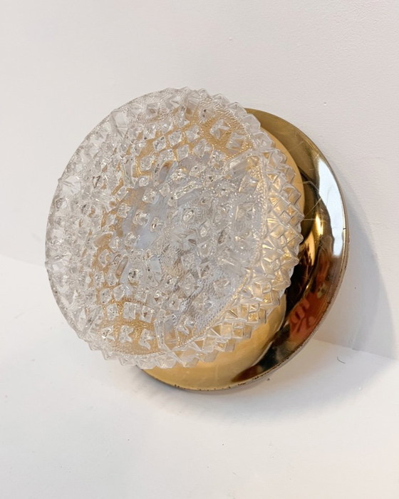 Elegant vintage ceiling or wall lamp from Spain, 1970s. The lamp has a gold-colored metal base and an etched glass shade. The lamp has a diameter of 25 cm and weighs 1.5 kg. The decorative glass gives the lamp a warm, diffused light. It has an E14 socket (bulb not included). In working order with minor signs of wear on the gold-colored base.