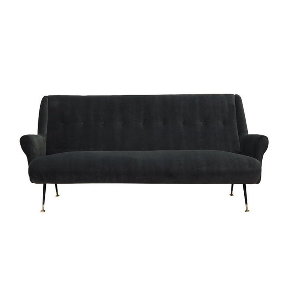 The legs of the furniture are made of metal. The sofa has undergone upholstery renovation, with the foam and fabric replaced with new ones. The upholstery is graphite-coloured, made of high-quality velour fabric.