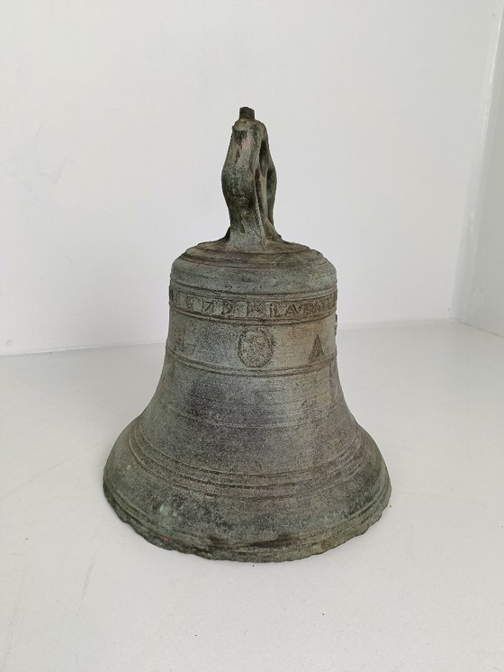 This antique church bell is a historical object, often made of bronze and cast in various sizes. These bells date back centuries and typically feature unique inscriptions, often in Latin, reflecting religious sentiments, the names of benefactors, or dedications to saints. They were typically cast by skilled artisans, and their age, craftsmanship, and inscriptions make them valuable artifacts that offer insight into the religious and cultural history of that period. The object shows signs of wear, as can be seen in the photos. A beautiful decorative object.