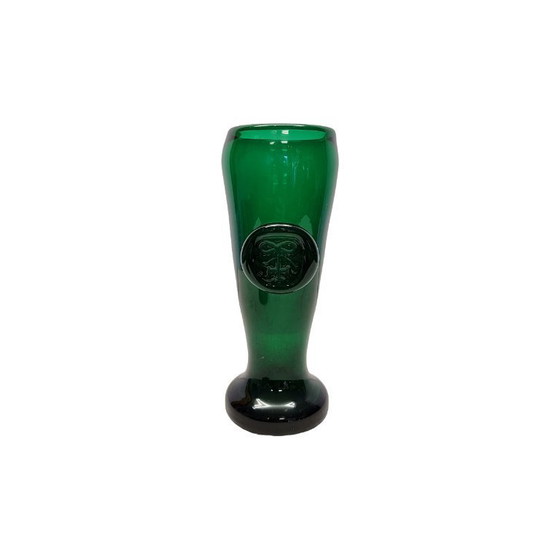 Green glass vase by Max Verboeket, dating from the second quarter of the 20th century. Small designer vase made of thick green glass with a Max Verboeket seal on the front. In neat condition, only some wear on the base from use.