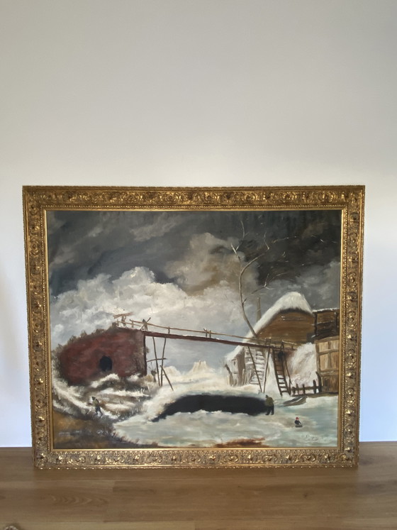This exquisite painting by Bolwerk is a testament to timeless artistry, capturing a serene winter landscape with remarkable detail. The scene, enveloped in soft hues of grey and white, is beautifully contrasted by the rich, ornate gold frame that adds a touch of opulence to the piece.