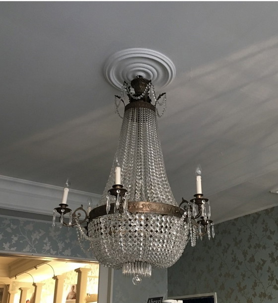This grand chandelier, with its elegant bag design, is a statement piece that will enhance any sophisticated interior. Standing approximately 120 cm tall and 90 cm in diameter, it features a stunning array of crystals that catch the light beautifully, creating a dazzling display. The chandelier is equipped with six internal and six external lights, providing ample illumination for any room. Although one of the candle holders is broken, it can be repaired, ensuring the piece retains its full grandeur. The chandelier has been disassembled for easy transportation, making it convenient for installation in your home.