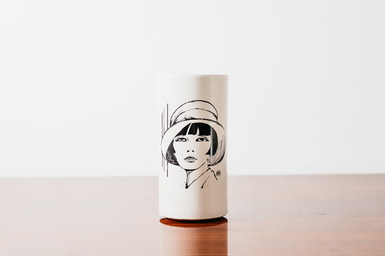 This extremely rare vase by Guido Crepax, in collaboration with Cotto Veneto, is entirely made of ceramic and depicts one of his most famous characters, Valentina. It is signed by the artist and bears the manufacturer's trademark on the bottom.