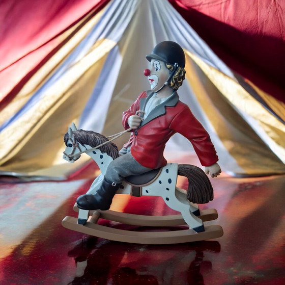 Discover this charming figurine of a Gilde Clown on a rocking horse, a beloved piece from the Comedy Collection.