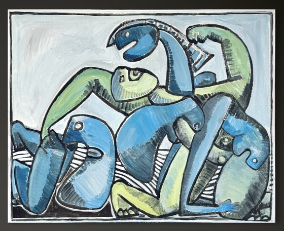 The palette, dominated by shades of blue, green, and gray, reinforces the unity of the composition. Internal nuances, achieved through hatching and gradations, lend depth and modeling to the volumes. This tension between formal simplification and anatomical suggestion gives the work a presence that is both sculptural and vibrant.