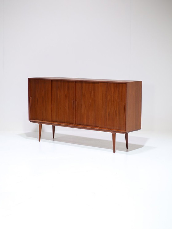 Highboard model 19, designed by Gunni Omann for Omann Jun in Denmark in the 1960s. This tall sideboard is made of teak. Behind the sliding doors are height-adjustable shelves and drawers. A timeless design with beautiful lines and exquisite details in the handles and legs. Danish quality and craftsmanship at its finest!