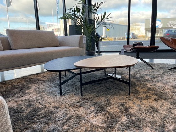 The playful tabletop is made of solid oak and is available in various sizes. The metal bases are only available in black. Very beautiful when placed as a set, and very elegant as a single table due to its natural round shapes. Guts Coffee Table Set: 90 cm in Light Oak Black Base (Update: SOLD) 110 cm in Black Oak Black Base (Update: Still available
