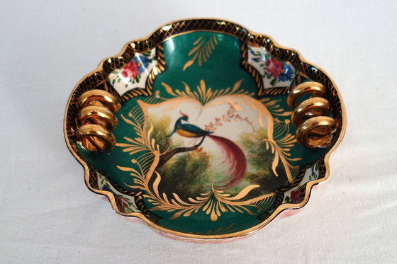 Hand-painted dish with bird design and gilded twisted handles, 1950s. Signed H Béquet Quaregnon (Belgium).