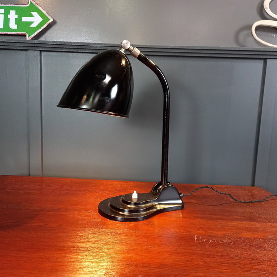 This sturdy iconic Bauhaus desk lamp from the Hanover lamp factory (Hala) dates back to 1935. This is model 556 and with its stepped base a picture to behold. The lamp has been rewired and given a clear coat of lacquer. Otherwise 100% authentic.