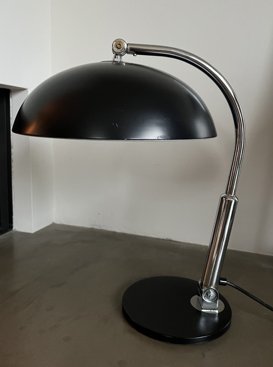 A genuine original vintage desk lamp, type "144," designed by H.Th.J.A. Busquet in 1932 for Hala Zeist. The lamp is adjustable at two pivot points, both at the shade and the base. Color: black. The lamp is in very good vintage condition. It measures 45 cm high and 30 cm in diameter. An absolute must-have for enthusiasts. It looks great in both vintage and modern interiors.