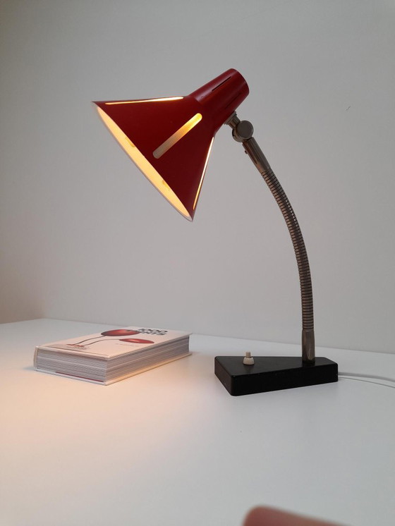 The combination of the red metal shade, the subtle light openings, and the flexible arm makes this lamp both functional and sculptural. On or off, it remains an eye-catcher.