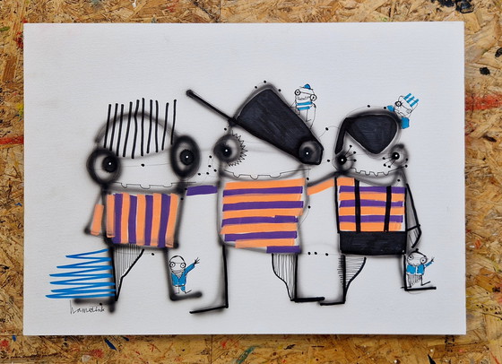 Made with marker, spray paint and acrylic on sturdy paper, carefully glued to a 1.8 cm thick MDF board.