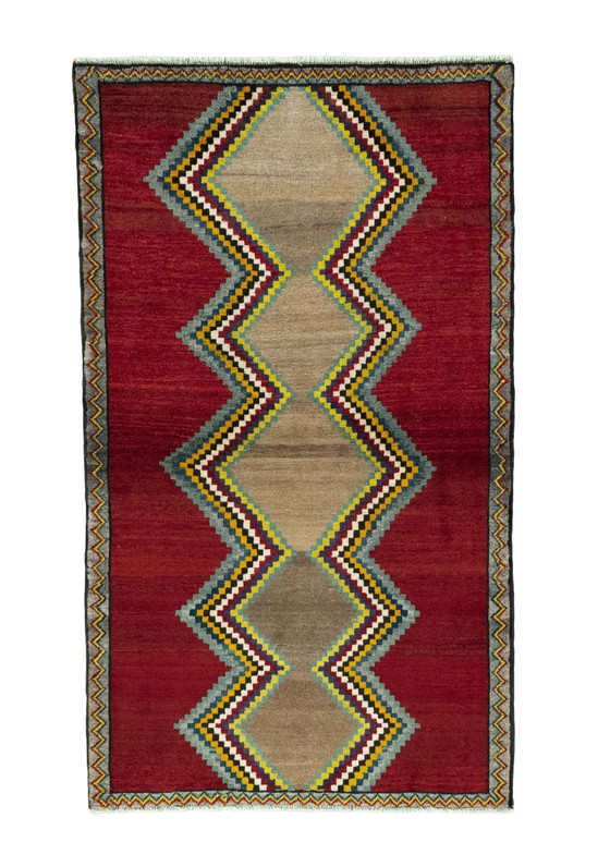 An extraordinary Gabbeh rug with a strong character! This hand-knotted unique piece comes from the traditional nomadic art and impresses with its striking zigzag pattern in bright colors on a strong Bordeaux red.