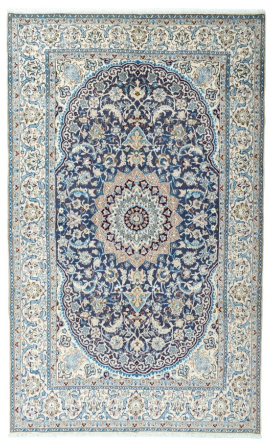 A timeless masterpiece from the art of carpet weaving in Nain: this elegant 9La rug has been precisely handcrafted and refined with a fine silk content. The finely crafted circular medallion design on a midnight blue background and the delicate floral ornamentation create a harmonious, elegant overall look.