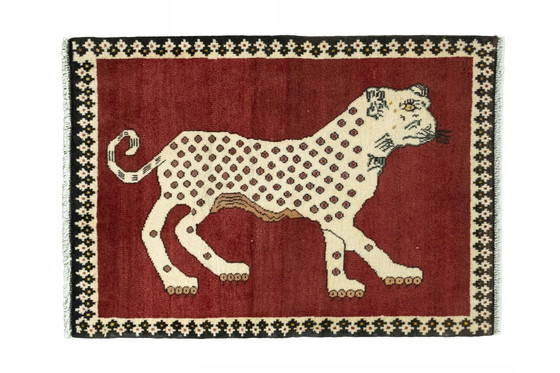 An extraordinary nomadic rug from Shiraz with an impressive tiger motif. This rug measures 118 x 85 cm and is hand-knotted from pure wool.