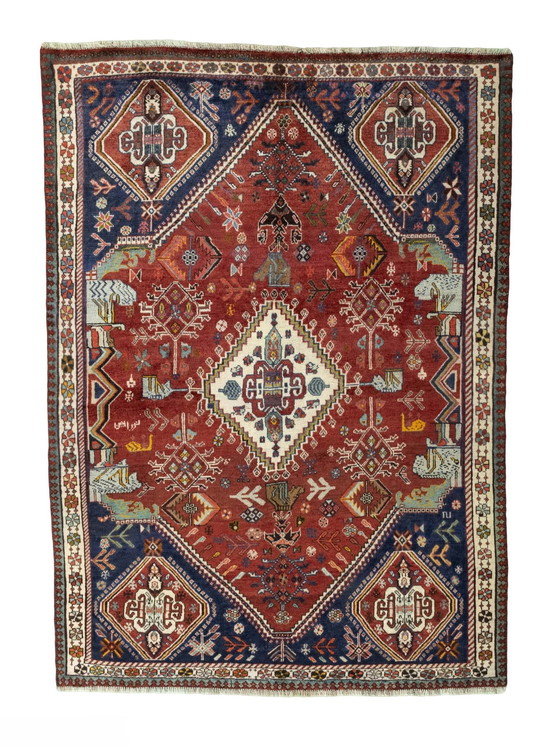 This hand-knotted Shiraz oriental rug is an impressive one-off with traditional nomadic motifs. With its warm color palette and detailed patterns, it brings an authentic piece of oriental craftsmanship into your home. ✔ Size: 217 x 155 cm ✔ Material: High-quality virgin wool - robust and durable ✔ Design: Classic Shiraz pattern with a central medallion and symbolic motifs ✔ Colours: Deep red, blue and cream with subtle accents ✔ Craftsmanship: Unique one-off - traditionally knotted by nomads 🌟 Special feature: The artistic design with animal and plant motifs makes this rug a real eye-catcher. 📦 Safe shipping: We offer safe and insured shipping so that your rug arrives safely. No: 54251