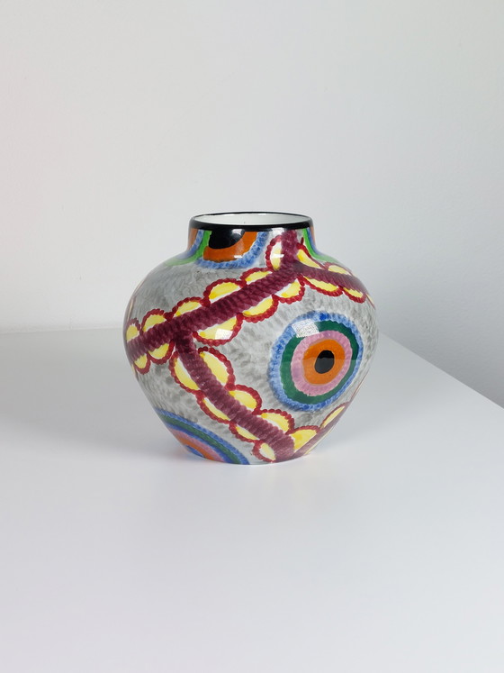 This exquisite hand-painted vase from Schramberg, designed by renowned designer Eva Stricker Zeisel, is a prime example of the Art Deco era. Its vibrant colors and artistic design make it a striking centerpiece in any room.