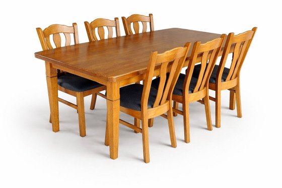 This handmade solid oak dining table set is a perfect blend of style and functionality. Its rich brown finish and classic design make it an ideal centerpiece for any dining room. The set includes six matching chairs with comfortable black textile seats, ensuring everyone has a cozy spot to enjoy meals together. Crafted from high-quality solid oak, this table promises durability and timeless elegance. The chairs feature a classic design with sturdy wooden frames and plush textile seating. Perfect for hosting dinner parties or enjoying everyday meals with loved ones. Don't miss out on this beautiful dining set that combines style and function effortlessly. It's ready to become the heart of your home!