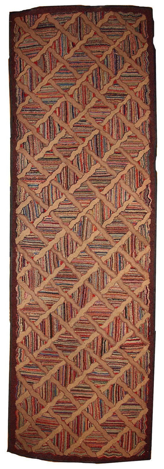 Antique hand hooked American runner in original good condition from the end of 19th century. This rug made in multiply colours and geometric design.