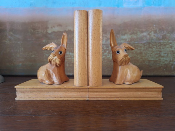 Particularly cute dogs made of wood, sitting on a bookend. Glass eyes make them look in all directions, adding to their cuteness.