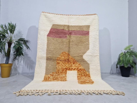 Discover the timeless elegance of this handcrafted Moroccan wool rug, measuring 250 cm by 150 cm. This handwoven masterpiece embodies the richness of boho design with its abstract patterns and natural hues of beige, brown, orange, and pink.