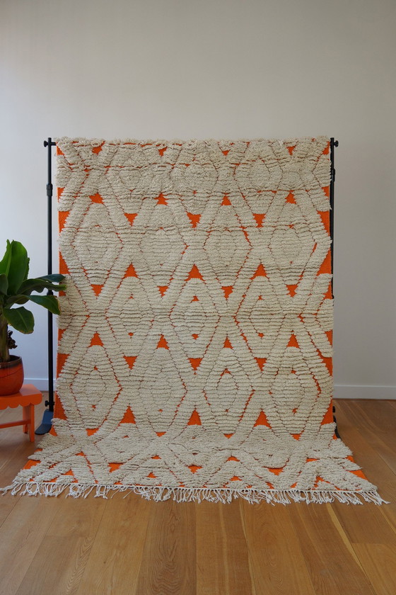 Give your interior a distinct character with this colorful, hand-woven wool rug from Tunisia. The warm orange background combined with a striking cream check pattern makes this rug a real eye-catcher in any room. It is hand-woven on traditional looms in the Kef region and made from 100% natural sheep's wool. This ensures a soft, warm and durable finish that will last for years.