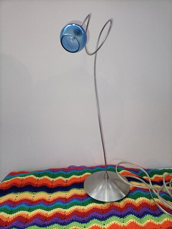 This elegant table lamp from Harco Loor Design combines modern design with functional lighting. The sleek metal frame and blue glass shade (with a few minor scratches) create a refined look that fits perfectly into a contemporary interior.
