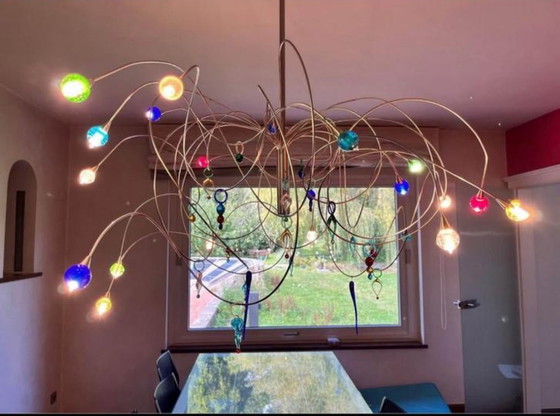 Magnificent Strawberry lamp, a well-known design by Harco Loor. Large version with 20 hand-blown Murano glass globes. Adjustable height between 50 and 100 cm. In good used condition. In its current form, approximately 86 x 80 x 100 cm, but can be reshaped (for example, oblong) if desired.