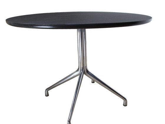 Its soberly finished round top rests on a brushed steel central leg, ensuring stability and modernity.