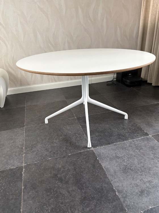 Another beautiful Hay table. Used, but with minor scratches. The legs are white-coated aluminum, and the tabletop is white laminate over wood.