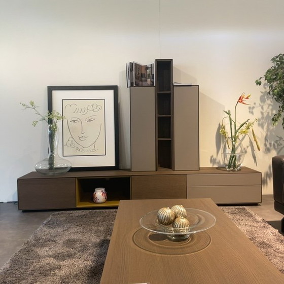 HCM Burano TV stand. A stylish TV stand with a playful effect thanks to its higher section. It combines modern and classic elements, making it a perfect fit for any interior. The unit consists of: 2 drawers, 2 doors, and 1 niche (including wall brackets). Color: Silk brown (wood) & taupe.