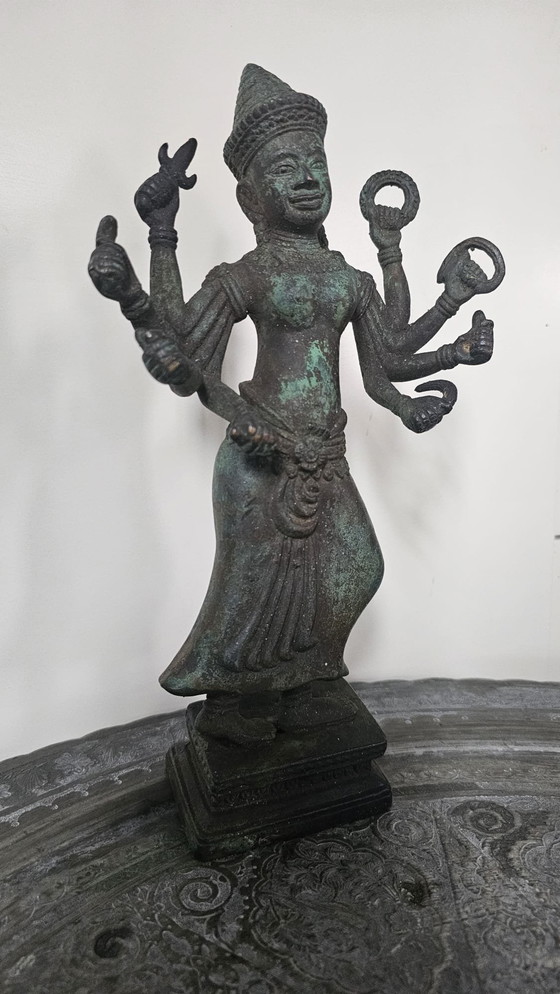 A heavy bronze Asian statue in Hindu-Buddhist style, with multiple arms and a calm, almost timeless expression. The pose is powerful yet restrained. The kind of object that carries a space without dominating.