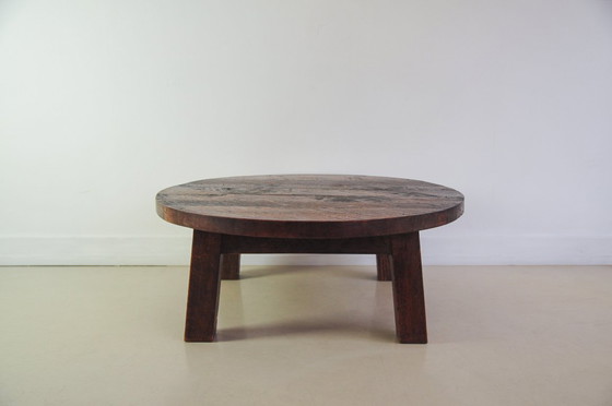 A heavy, vintage, round, brutalist coffee table. This coffee table is robust and heavy and can withstand a knock or two. It would look beautiful in a sleek, bright interior. This table belongs to the original owner.