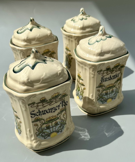 Offered is a very decorative set of four Herr brand ceramic tins, made in Germany.