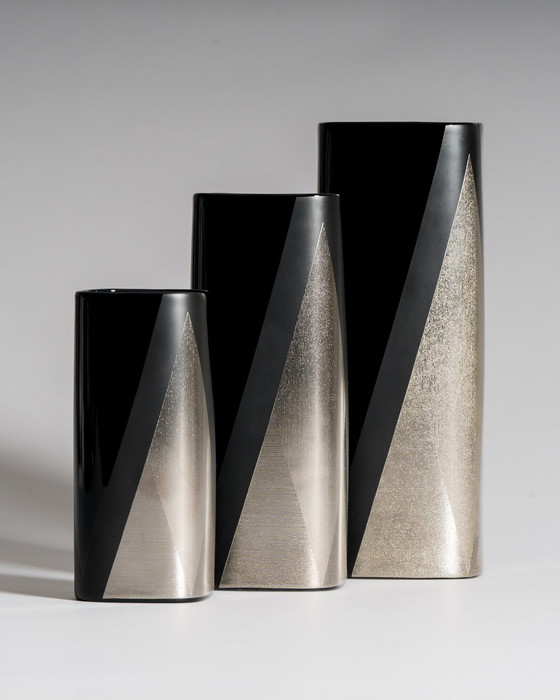 A striking embodiment of late 20th-century German design, this exquisite *Platinnebel* vase trio was created by industrial designer **Helmut Drexler** for **Rosenthal Studio Linie**, the experimental wing of Rosenthal AG renowned for its collaborations with leading figures of the Bauhaus and postwar modernism.