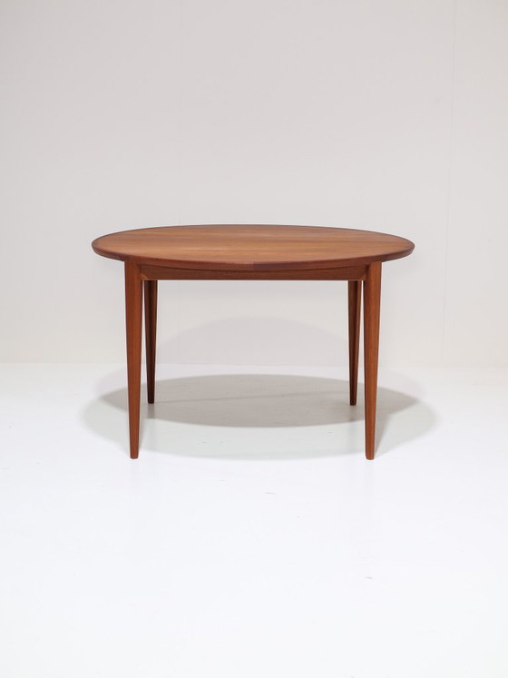 Rare extendable dining table designed by Henry Rosengren Hansen for Brande Møbelindustri in Denmark, 1960s. This round teak table is suitable for 4 people. Using a 'Butterfly leaf' / folding tabletop, which can be stored under the table, it can be extended to an oval dining table for 6 people. The solid wood rim and legs are elegantly designed with unique, refined details and subtle curves. This gives the table a minimalist, interesting, and stylish silhouette.