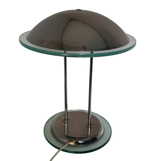 1980's desklamp made by the Dutch company Herda. It resembles the Memphis style period with it's symetrical shape and almost blue glass. Often referred to as a mushroom lamp or ufo lamp, due to its design it fits great in a memohis style or space age design as a more contemporary setting. In good, vintage condition.