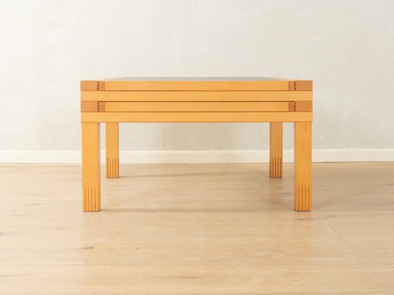 Modular HEXA coffee table from the 1980s, characterized by clear lines and a captivating material contrast. Designed by Bernard Vuarnesson for the Italian manufacturer Bellato, it impresses with subtle yet effective details such as the fine grooved milling on the legs. Warm, light brown beech wood meets durable dark blue and white Resopal panels, creating an exciting balance. Craftsmanship is revealed in the striking dovetailed corner joints. A carefully refurbished, timeless piece of furniture in very good vintage condition.