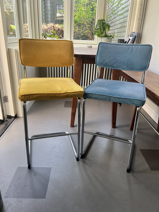 Two bar stools with a chrome base and a corduroy seat. One stool is yellow and the other is blue. They have a backrest and a footrest. Seat height 70 cm. They are really comfortable! We have a new, larger table with more seating, so we need slightly narrower stools.