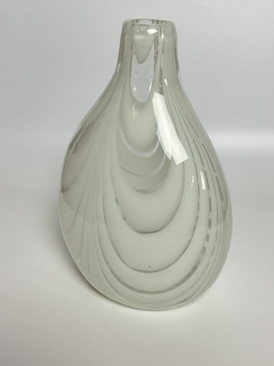 A finely handblown antique glass vase, attributed to the Victorian Nailsea loop-glass craftsmanship featuring beautifully encased white looping spirals withing thick, clear glass. The decorative white pattern is fully integrated into the body. The base shows a subtle concave pontil area with a softened hand-finished mark, consistent with authentic mouth-blown glass of the period. Dimensions: Height 30 Width 20 Depth 13 Diameter Top 5 Diameter opening 3,5 cm