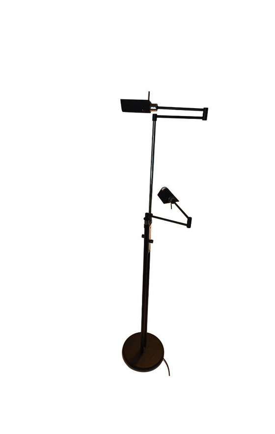 Very nice two-arm swing reading lamp. Both rods adjustable in height. Both arms fold in and out. Both shades rotatable. Both lamps individually on and off and dimmable using the rotary knobs. Lots of nice details and very clean vintage condition. So a few small spots as shown in the pictures. These are rarely offered and are really high quality.