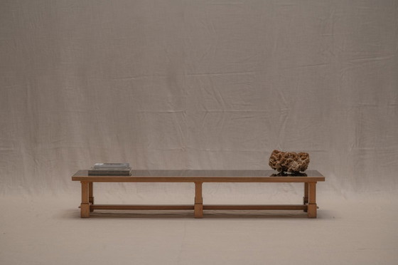 A striking brutalist coffee table from the 1960s, crafted in solid oak with a light stain that highlights the natural grain. The design is carefully considered—its base reveals subtle mid-century detailing, while the proportions create a sense of balance and architectural clarity.