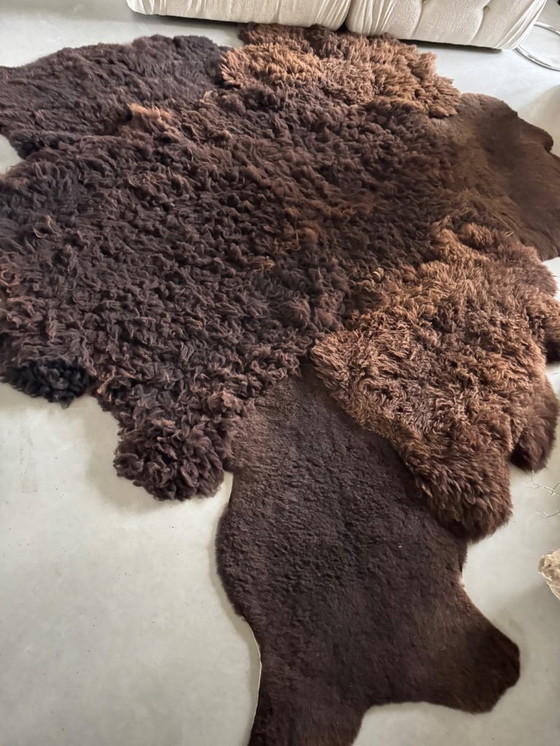 Beautiful, fully handmade rug made from various types of brown sheepskin.
