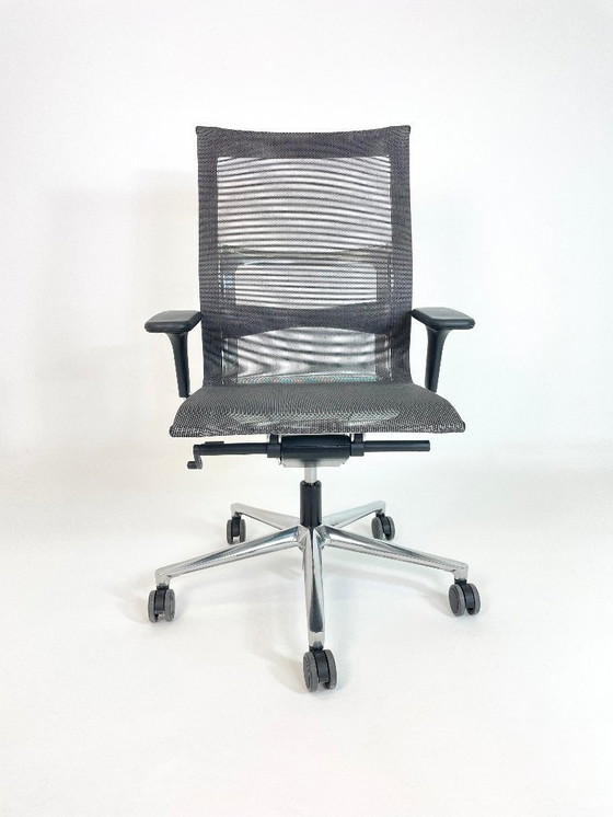 ICF UNA Plus desk chair, with a die-cast aluminum frame, a five-star base on casters, and a gray mesh seat. The chair swivels and is height-adjustable; the backrest reclines with a lock and force regulator; the armrests are height-adjustable and swivel; and the lumbar support is height-adjustable. This designer product combines refined aesthetics with extreme durability and functionality. In excellent condition, as shown in the attached photos. The base is in perfect condition, with no holes or tears. The mechanisms work perfectly. Availability: 20 pieces.