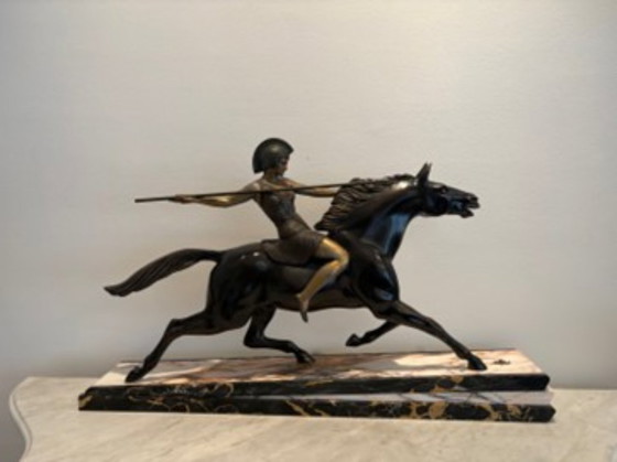 An exceptional and imposing Art Deco sculpture capturing a dynamic scene: a powerful animal in full stride bearing an elegantly stylized female rider. The composition is mounted on its original multi-tiered veined marble base, a hallmark of French and Belgian decorative arts from the interwar period.