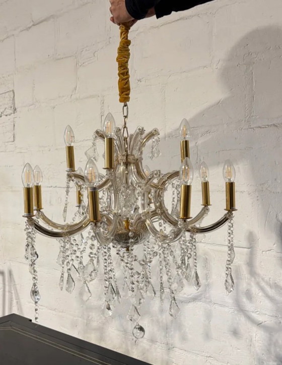 12-lamp Napoleon crystal chandelier with gold-colored structure. The Napoleon chandelier fills the room with a sparkling light show. This is created by numerous elements of clear, cut glass and crystal that refract the light. Twelve sockets, designed as candleholders, each hold an E14 bulb. The metal housing has a gold finish.