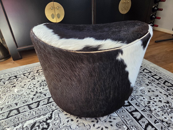 Add a touch of style and comfort to your interior with this swivel IKEA pouf, upholstered in luxurious cowhide. Perfect as an extra seat or a footstool, this pouf is a versatile addition to any room.