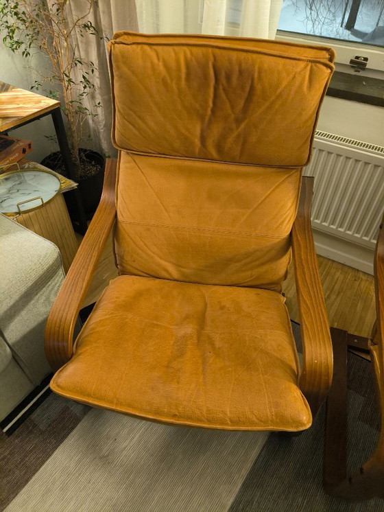 Experience the timeless elegance of the Ikea Poäng Chair, a masterpiece designed by Noboru Nakamura. This pair of chairs offers both comfort and style, making them a perfect addition to any living space. The warm tones of the leather upholstery invite relaxation, while the sleek wooden frame adds a touch of sophistication to your home decor.