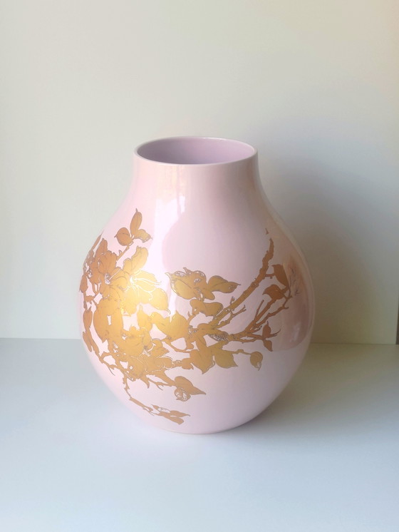 Ceramic, pink glaze with gold floral decoration, Height approximately 34 cm, diameter 30 cm Worth mentioning: The vases are no longer in production.